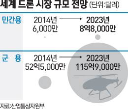 우리나라는 군용 드론 활용도는 세계 10위 안에 들 정도지만 민간상업용 드론 시장은 미미하다. 산업통상자원부에 따르면 전 세계 민간 드론 시장 규모는 지난 2014년 6,000만달러에 불과했지만 오는 2023년에는 8억8,000만달러로 급성장할 것으로 전망된다. 하지만 드론 시장의 절반 이상은 중국에 본사를 둔 DJI·FLYPRO 등이 차지하고 있다. 1월 미국 국제전자제품박람회(CES)에서도 드론 전시에 참가한 29개사의 절반 이상이 중국 회사들이었다. 미국에서는 최초의 스마트드론 '솔로'를 출시한 3D로보틱스가 지난해 연매출 5,000만달러를 기록했고 유럽 대륙에서는 프랑스 기업 패럿 등이 저렴한 드론을 내놓고 중국 업체들과 경쟁하고 있다.