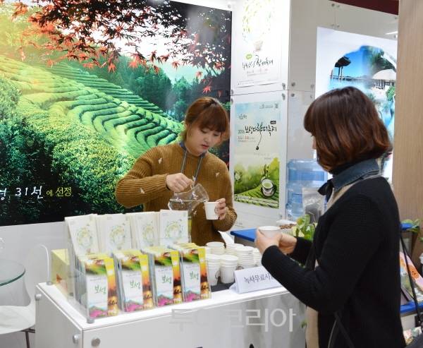 | ▲ 보성군 홍보부스에서 관람객에게 녹차시음을 할 수 있게 컵에 따라주고 있다. |