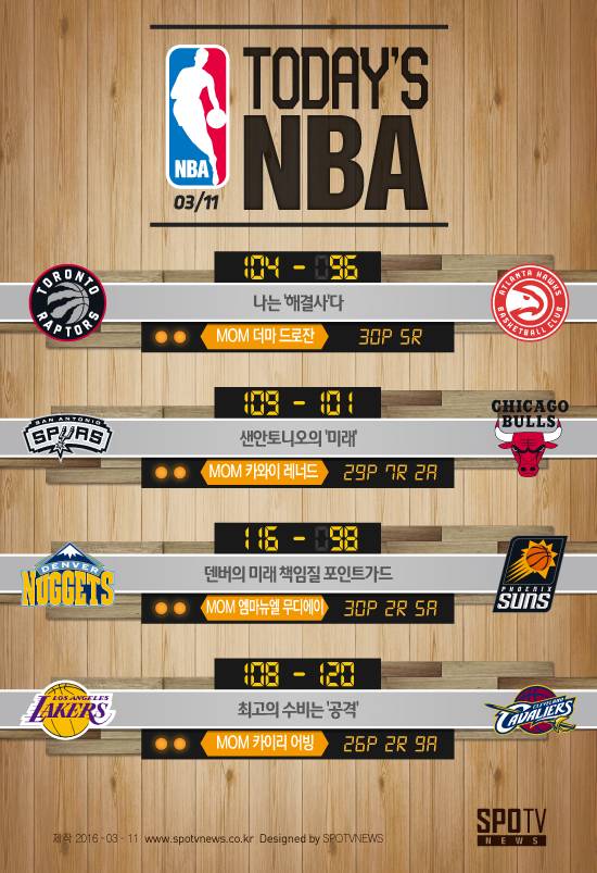 토론토는 11일(한국 시간) 캐나다 온타리오주 토론토 에어캐나다 센터에서 열린 2015~2016 미국 프로 농구 정규 시즌 애틀랜타 호크스와 홈 경기에서 104-96으로 이겼다. 토론토의 해결사 드로잔은 35분을 뛰며 30득점 5리바운드를 기록하며 팀 승리를 이끌었다. 드로잔은 시즌 13번째 30점 이상을 뽑았다. '공룡 발톱' 드로잔을 비롯해 카일 로우리가 19득점 등 토론토 선수들은 고르게 활약을 펼쳤다.