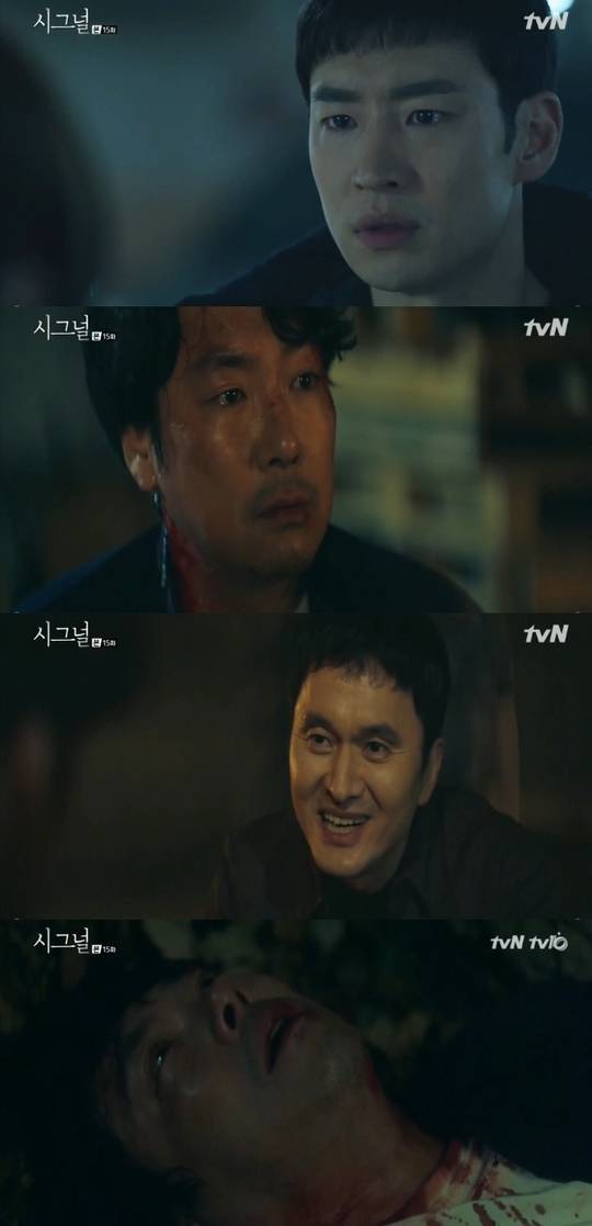 이재한은 안치수(정해균 분)의 총에 죽었다. 그 시간이 오후 11시 23분이었고 박해영과 무전은 그렇게 시작됐다. (사진=tvN '시그널' 15회 캡처)