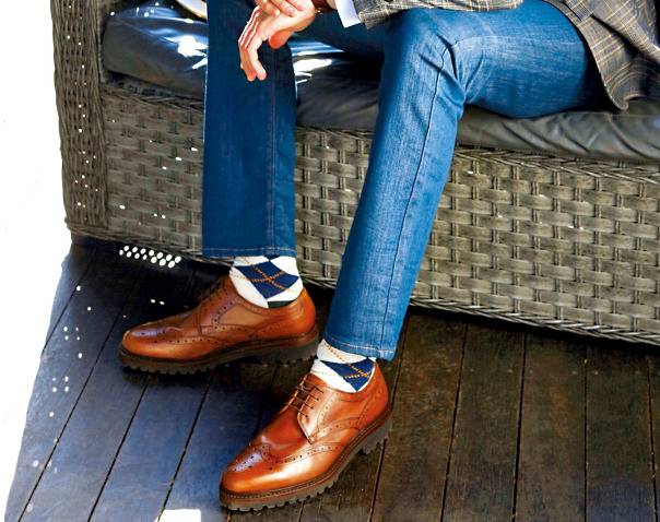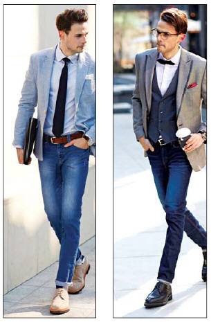 가장 무난한 선택은 스트레이트 진과 브라운 윙팁 구두의 조합이다. 비즈니스 캐주얼에 어울리는 청바지를 고를 때는 화려한 워싱, 찢어진 장식 등을 뺀 기본 색상의 스트레이트 진을 선택하는 것이 정석이다. 상의 역시 너무 튀는 디자인보다는 체크무늬가 들어간 클래식 재킷 등으로 균형을 맞춰주는 게 좋다. 위아래 모두 밋밋해지기 쉬운 이런 옷차림에 포인트를 주는 게 갈색 윙팁 구두다. 윙팁은 구두코에 날개 모양의 W자 장식이 들어간 구두를 말하는데, 남자의 패션을 한층 멋스럽고 세련되게 바꿔준다.