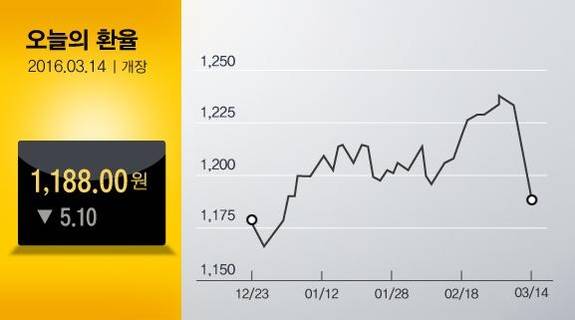14일 오전 9시 17분 현재 서울 외환시장에서 원달러 환율은 전날보다 3.6원 내린 1189.5원에 거래되고 있다. 이날 원달러 환율은 전날보다 5.1원 내린 1188.0원에 거래가 시작됐다. 원화가 장중 1180원대로 내려온 것은 지난달 11일(1189.0원) 이후 한 달여 만이다.