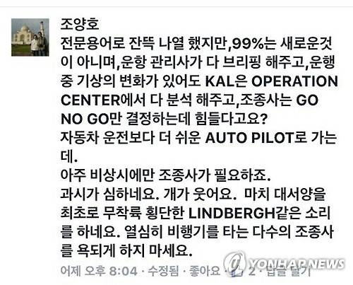 조 회장은 "전문용어로 잔뜩 나열했지만 99%는 새로운 것이 아니며 운항관리사가 다 브리핑해주고, 기상변화는 오퍼레이션센터에서 분석해준다"며 "조종사는 GO, NO GO(가느냐, 마느냐)만 결정하는데 힘들다고요? 자동차 운전보다 더 쉬운 오토파일럿으로 가는데"라고 적었다.