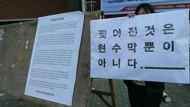 이날 오후 1시간30분 동안 피켓을 든 15학번 김수연씨는 “지나가면서 ‘수고하십니다’ ‘응원합니다’라고 힘주고 가는 사람들이 많다. 캔커피랑 초콜릿을 주고 간 사람도 있다”면서 “내 주변엔 교수를 옹호하는 사람이 한 명도 없다. (이 사태는) 명확히 성소수자 혐오 문제라고 합의된 상태”라고 말했다.