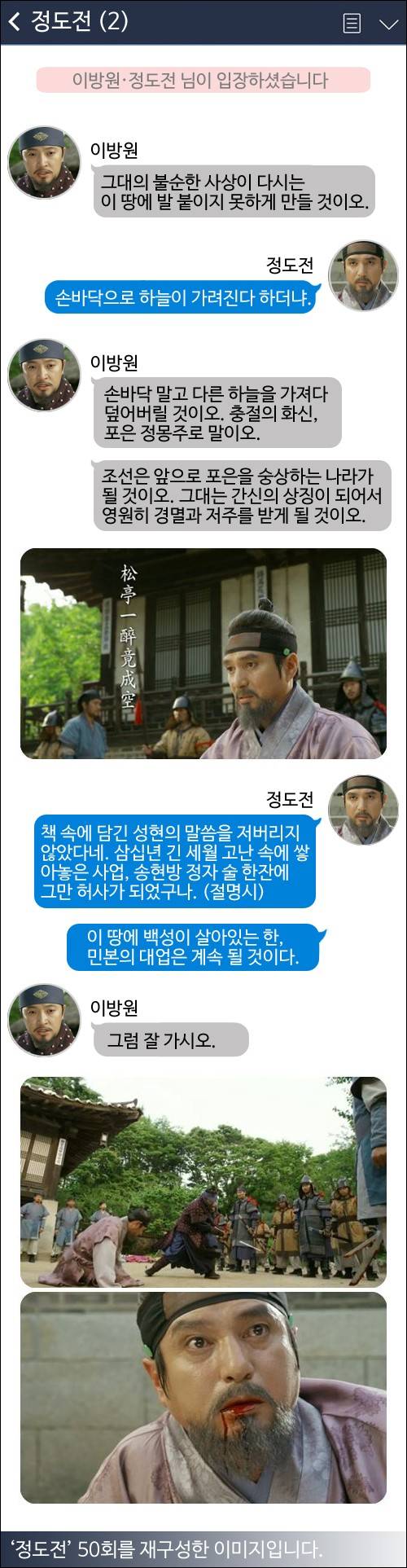 ▶ 정도전 : 청하건대 죽이지 마시오. 예전에 공이 이미 나를 살렸으니, 지금도 또한 살려 주소서.