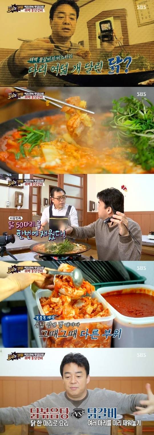 이어 "그리고 닭볶음탕과 확실히 다른 것이 닭볶음 탕은 일단 국물을 먹으면 얼큰한데 닭을 먹으면 양념이 덜 배어 맛이 심심하다"며 "물닭갈비는 반대다. 오히려 국물은 심심한데 닭고기는 양념을 미리 재워놔 그 맛이 다 배어있다. 고기맛이 다르다"고 덧붙였다.(사진= SBS '3대천왕' 캡처)