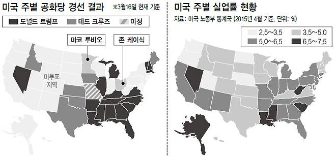 또한 미국 각 주의 최근 실업률을 보면, 신기하게도 실업률과 트럼프에 대한 지지를 보낸 주가 겹치는 것을 알 수 있다.(그림2) 이는 세계화로 인해 붕괴된 삶을 경험하고 있는 백인 블루칼라 노동자들이 대거 공화당 전당대회장으로 몰려들었고 그들의 표심은 월가를 대변하는 공화당 주류 후보들을 제치고 국수주의를 표방하는 아웃사이더 트럼프에게 열광했다는 뜻이다.