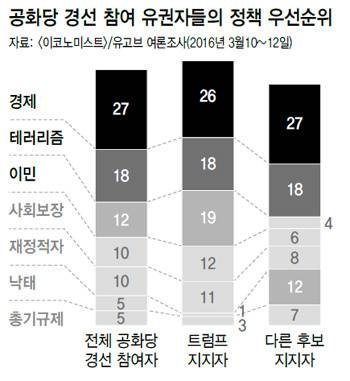 구체적으로 정책을 뜯어보면, 트럼프 지지자들의 욕구를 알 수 있다. 공화당 경선에 참여한 유권자들이 선호하는 정책의 우선순위를 보면 경제(27%), 테러리즘(18%), 이민(12%), 사회보장(10%), 재정적자(10%), 낙태(5%), 총기 규제(5%) 순서였다. 그런데 트럼프와 다른 공화당 후보 지지자들로 구분해보면, 트럼프 지지자들은 그동안 공화당 주류가 상대적으로 등한시해온 이민이나 사회보장과 같은 정책에 더 높은 순위를 부여한 반면, 다른 후보 지지자들은 낙태나 총기 규제 등 공화당의 전통적인 쟁점을 우선시하고 있다.