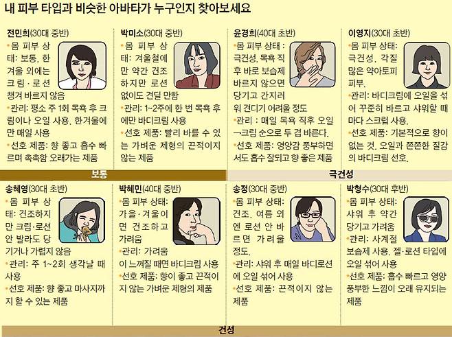 드디어 긴 겨울이 가고 봄이 시작된 것 같습니다. 하지만 우리 피부는 겨울보다 더 건조해져 가렵기까지 합니다. 각질도 많이 생기고요. 전문가들은 겨우내 건조해진 환경에 지쳐있던 피부가 환절기에 더 건조하게 느껴지는 거라고 합니다. 그래서 봄철 우리 몸을 촉촉하게 만들어줄 바디로션을 품평해 봤습니다. 품평 대상은 백화점에서 가장 잘 팔리는 제품 4가지입니다. 향이 좋은 제품부터 바르면 피부 탄력이 높아지는 바디로션까지, 어떤 게 좋은지 자신의 피부 타입과 비슷한 아바타의 선택을 따라가 보세요.
