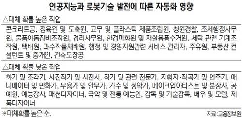 대체 확률이 낮은 직업 1∼5위는 화가·조각가, 사진작가·사진사, 작가 및 관련 전문가, 지휘·연주자와 작곡가 등 감성에 기초한 예술 관련 직업들이었다.
