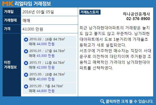 서울시 서대문구 남가좌동에 위치한 남가좌현대아파트는 1999년 5월 입주한 최고 20층, 총 10개동 1155세대 규모이며, 전용면적 84.78㎡는 258세대이다. 국토교통부 실거래자료를 기준으로, 가장 최근 거래 건은 지난 2016년 2월에 신고 된 16층 매매가 4억 4,000만 원이다.
