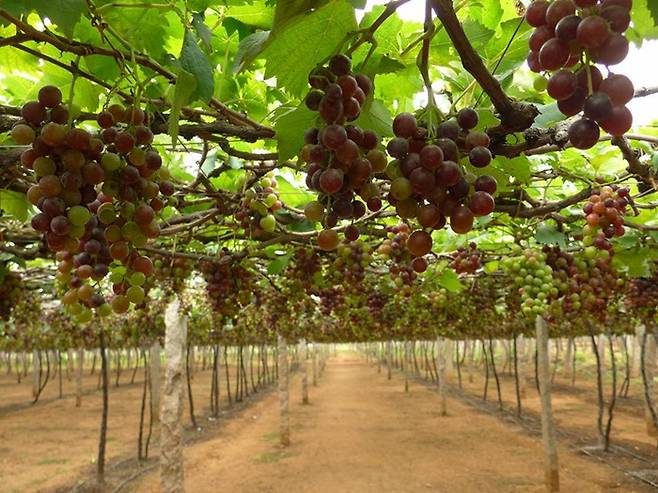 주인이 나오더니 가게뒤에 있는 포도밭구경을 하란다. 포도밭이 엄청 크다. 포도밭은 여러 구역으로 나눠져있는데 설익은 포도밭 다익은 포도밭 새로 순이 나는 포도밭 잎떨어진 포도밭등으로 나눠져있다. 일년내내 포도생산이 가능하다. 포도밭에서도 이놈의 인기는 시들줄을 모른다. 단체손님들이 줄지어 사진찍자고 한다. 어떤 신사분은 비디오로 찍기까지 하신다. 기사땜에 짜증은 났지만 그래도 한국인의 명예를 걸고 생글생글 웃었다.