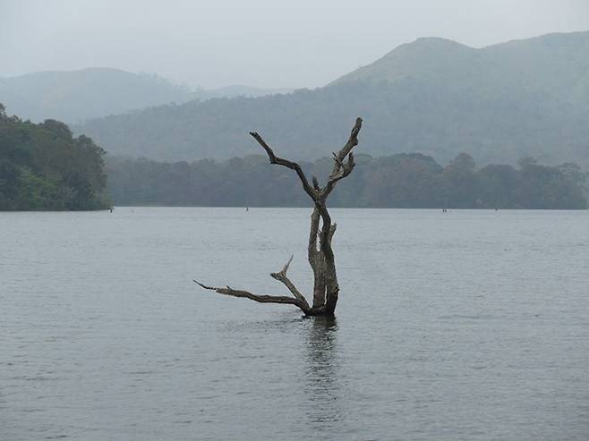 페리야르호수는 영국식민지시절 수력발전소를 지으면서 생긴 댐때문에 만들어진 호수다. 원래 숲과 마을이던 곳이 수몰되면서 고사한 나무들이 수면위로 남은 모습들이 특징적인 경치가 되었다. 실제로 보면 그저 그런 경치가 사진은 그럴듯하다. 수면위로 남은 나무둥지에 새가 앉은 장면은 인상적이다.