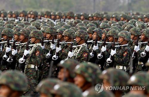 epa05232350 Myanmar military soldiers march during a parade commemorating the 71st Armed Forces Day parade in Naypyitaw, Myanmar, 27 March 2016. The Myanmar government celebrated the 71st Armed Forces Day to mark the commemoration of the start of Burmese Army's resistance against Japan's occupation in 1945. EPA/NYEIN CHAN NAING