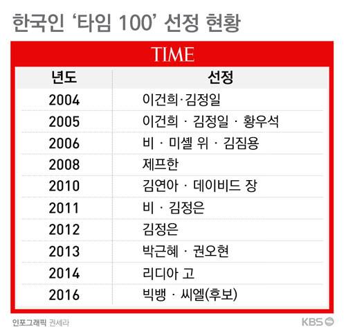 한국인으로는 2004년에 이건희 삼성그룹 회장이 '건설자와 거인' 분야에, 김정일 북한 국방위원장이 '지도자와 혁명가'분야에 이름을 올린 이래 2007년과 2009년 그리고 지난해를 제외하고는 매년 한두 명이 100인에 선정되고 있다.