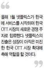 올해 1월 넷플릭스가 한국에 서비스를 시작하며 한국 OTT 시장의 새로운 경쟁 주자로 합류했다. 넷플릭스의 진출은 성장이 아직은 미진한 한국 OTT 시장 확대에 촉매 역할을 할 것이다. 분명한 것은 OTT 시장의 성장세가 관련 산업 전반에 나비효과를 일으킬 수 있다는 점이다. 예견되는 변화를 어떻게 수용할지 준비하는 것은 우리의 몫이다.