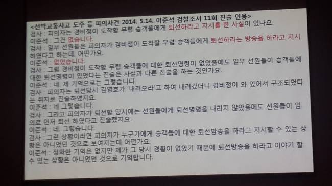 검찰 조사에선 퇴선 지시를 하지 않았다고 진술한 점을 꼬집은 김 위원에 대해 이 선장은 “당시엔 약 20여일간 오전 1~2시까지 조사를 받아 힘들었다. 스스로의 잘못을 반성하는 의미로 퇴선 명령을 했는데도 불구하고 하지 않았다고 증언했다”고 덧붙였다.