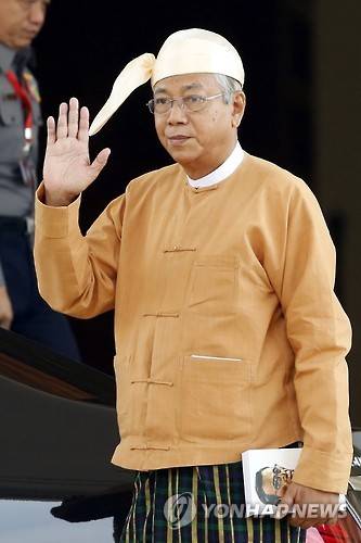 epa05235749 New Myanmar president Htin Kyaw waves after taking oath in a swearing in ceremony as he leaves the Union Parliament in Naypyitaw, Myanmar, 30 March 2016. The new president of Myanmar, Htin Kyaw was sworn in on 30 March as the first elected civilian president in more than 50 years. Htin Kyaw, 69, from the National League for Democracy (NLD), was elected this month by the legislature. The NLD gained an absolute majority with a landslide win in elections last November. The new president will rule as a confidant of Suu Kyi, who is not qualified for the presidency because of a rule in the Constitution adopted by the military junta, which vetoes candidates with foreign families. EPA/HEIN HTET
