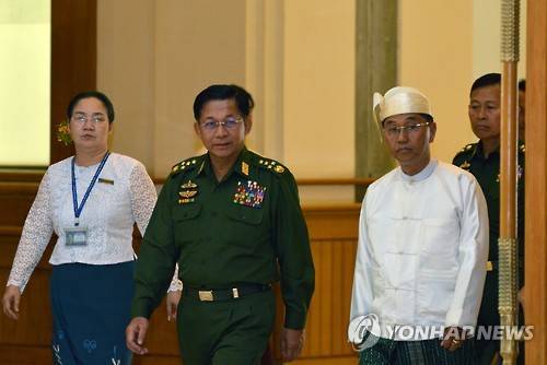 Myanmar's commander-in-chief, General Min Aung Hlaing, second left and Myint Swe, second right, 1st -vice president of Myanmar walk out of Myanmar's parliament in Naypyitaw, Myanmar, Wednesday, March 30, 2016. Htin Kyaw, a trusted friend of Nobel laureate Suu Kyi, took over as Myanmar's president Wednesday,taking a momentous step in the country's long-drawn transition toward democracy after more than a half-century of direct and indirect military rule. (AP Photo/Aung Shine Oo)