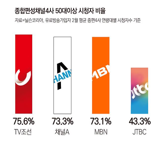 가구 시청률에 거품, 개인시청자수는 MBN이 1위, 25만명 수준… TV조선 50대 이상 시청자 비율 75.6%