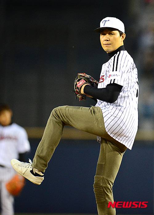【서울=뉴시스】김진아 기자 = 1일 오후 서울 잠실야구장에서 열린 ‘2016 타이어뱅크 KBO 리그’ 개막전 LG 트윈스와 한화 이글스의 경기, 배우 박성웅이 시구를 하고 있다. 2016.04.01.