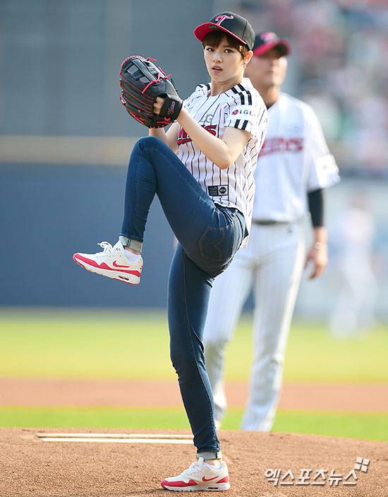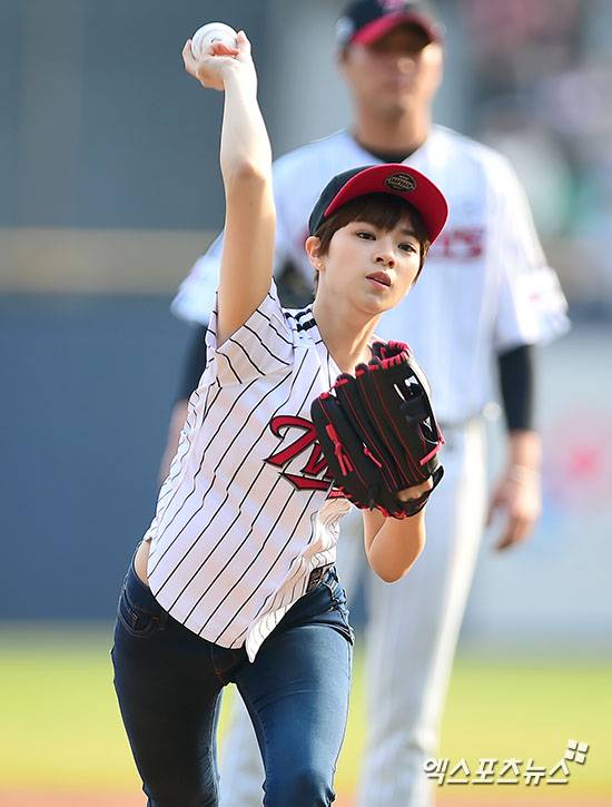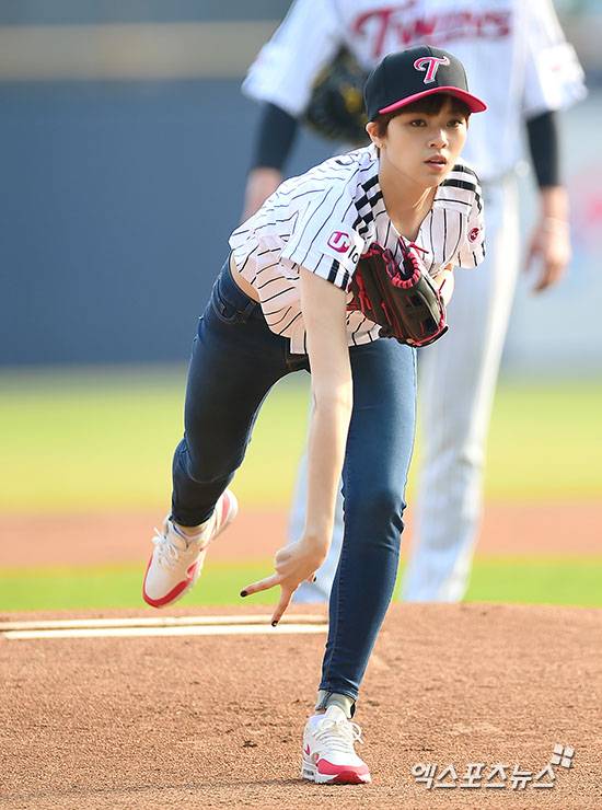 [엑스포츠뉴스=김한준 기자] 2일 오후 서울 송파구 잠실야구장에서 열린 '2016 타이어뱅크 KBO리그' 한화 이글스와 LG 트윈스의 경기, 걸그룹 트와이스 정연이 시구에 임하고 있다.
