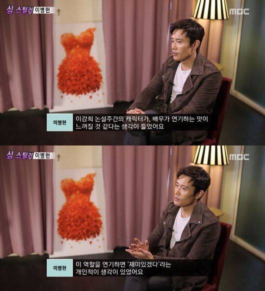 3일 방송된 MBC '출발 비디오여행'에서 이병헌은 "'내부자들'에서 백윤식 선생님이 맡은 이강희 논설주간 역할이 탐났다. 배우가 연기하는 맛이 느껴질 것 같은 생각이 들었다"고 말했다.