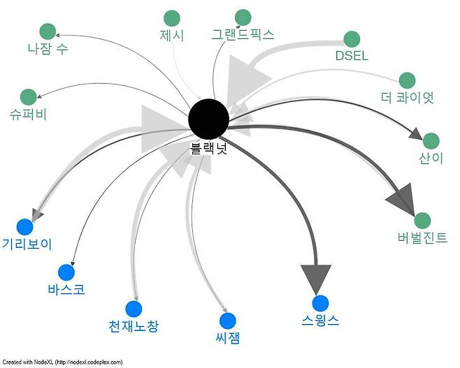 | ▲ 블랙넛의 음악적 관계도 파란색점은 같은 소속사 저스트뮤직 멤버들. <쇼 미 더 머니> 프로듀싱 및 랩, 작곡, 피쳐링, 믹스, 마스터, 녹음 등. '블랙넛'이 음악적으로 직간접적으로 관여했거나 관여받은 뮤지션들과의 관계 1회당 화살표 굵기 1씩 계산해 노드엑셀로 시각화했다. 평소 '나는 모든 체계가 싫다'며 해체주의 성향을 보인 천재노창의 영향력이 눈길을 끌었다('자유해방' 'Indigo Child'). |