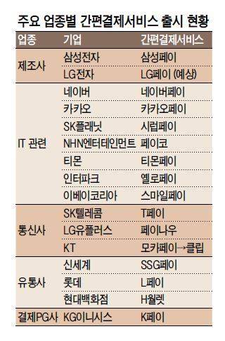삼성전자의 삼성페이를 필두로 인터넷 포털(네이버ㆍ카카오), 이동통신사(SK텔레콤ㆍLG유플러스ㆍKT), 유통사(신세계ㆍ롯데ㆍ현대백화점), 게임사(NHN엔터테인먼트) 등 다양한 업종에서 20가지 넘는 페이 서비스가 출시됐다.