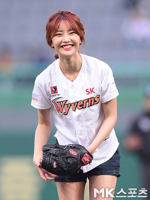 경기에 앞서 EBS 레전드히어로 삼국전에서 서서역의 신인 배우 한가림이 시구를 하고 있다.