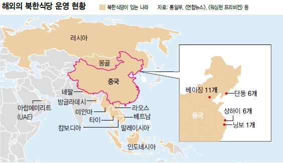 북한 당국은 외화벌이 등의 목적으로 중국과 캄보디아, 라오스, 베트남 등 동남아시아 일대에 식당을 운영하고 있는 것으로 알려졌다. 정부는 130여곳의 식당이 해마다 1천만달러(약 115억원)를 본국에 보내고 있으며, 이 중 90%가 중국에 위치한 것으로 추산하고 있다. 미국의 온라인 매체 <워싱턴 프리비컨>은 2013년 미국 등 서방 정보기관을 인용해 국외 북한 식당들이 해마다 180만달러를 북한에 보낸다고 전하기도 했다. 북한 식당에서 일하는 종업원들은 북한에서 선발 과정을 거쳐 춤, 노래, 마술까지 다양한 교육을 받은 뒤 파견되며, 외국 현지에서도 집단생활을 하고 있는 것으로 전해진다. 북한 식당은 2000년대 초반엔 종업원들이 ‘남조선’이 아닌 ‘한국’이란 용어를 쓰고 한국 노래를 부르면서 남쪽 관광객들을 맞이하며 남북 교류의 상징으로 여겨졌으나, 남북관계가 경색되면서부터는 ‘외화 창구’로서의 이미지가 더 강해졌다.