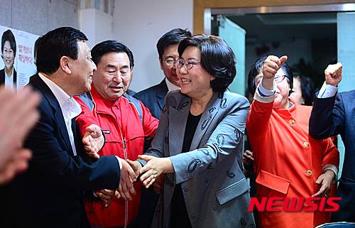 【서울=뉴시스】김진아 기자 = 제20대 국회의원 선거 서울 서초갑에 출마한 새누리당 이혜훈 후보가 당선 확정이 예상되자 13일 오후 서울 서초구 자신의 선거사무소에서 지지자들과 기뻐하고 있다.