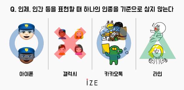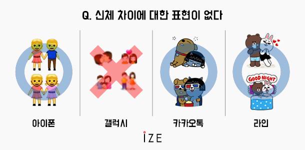 [스마트폰, 특히 메신저에서 주로 쓰는 이모티콘은 이제 새로운 언어라 해도 과언이 아니다. 한국 전체 인구 중 75%가 카카오톡을 사용하는 시대에 이모티콘은 오히려 언어로는 표현하기 어려운 감정까지도 표현하는 수단이 됐다. 메신저 카카오톡과 라인은 쉴 새 없이 새로운 이모티콘을 만들어내고, 애플과 삼성 등 스마트폰 업체들도 시간이 흐를수록 더 다양한 이모티콘을 내놓고 있다. [아이즈]가 마치 벡델 테스트(미국의 만화가 엘리슨 벡델이 남성 중심 영화가 얼마나 많은지 계량하기 위해 고안한 영화 성평등 테스트)처럼 나름의 기준을 통해 이모티콘에 인종‧성별‧신체조건 등 차별적인 표현이 있는지 확인한 것은 이 때문이다. 이 새로운 언어는 누구에게도 차별 없이, 상처 주는 일 없이 쓰여야 한다. 테스트 대상은 애플의 아이폰, 삼성의 갤럭시, 카카오톡 프렌즈, 네이버의 라인이다. (○=통과, △=일부 통과, X=통과하지 못함)]