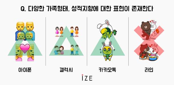 갤럭시: 남/여, 남/남, 여/여가 손을 잡고 있는 이모티콘이 존재한다. 남자, 여자, 여자아이로 구성된 가족형태 이모티콘이 1개 있다.