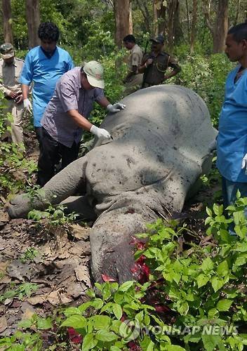 epa05258554 Indian forest officials examine the carcass of a dead one horned Rhino which was killed by poachers inside the Kaziranga National Park in Nagaon district of Assam state, India, 14 April 2016. According to a news report, Poachers killed a male one horned Rhino in Budhapahar Range and took away the horn in the early hours of 14 April 2016 during the visit of the British Prince William, Duke of Cambridge and his wife Catherine, Duchess of Cambridge to Kaziranga. Total 103 empty cartridges of AK 47 rifle were recovered from the spot. The 480-square-kilometer (185-square-mile) grassland Kaziranga is home to the world's largest population of one-horned rhino. EPA/STR