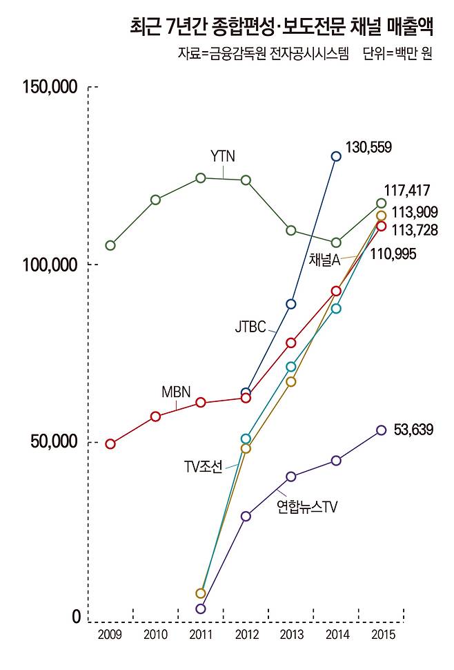 또 다른 보도 전문 채널 연합뉴스TV의 매출액은 2011년 36억 원, 2012년 296억 원, 2013년 407억 원, 2014년 452억 원, 2015년 536억 원으로 매년 증가하고 있다. 예년 80억 원 수준이던 적자도 지난해 18억 원으로 줄어들었다.
