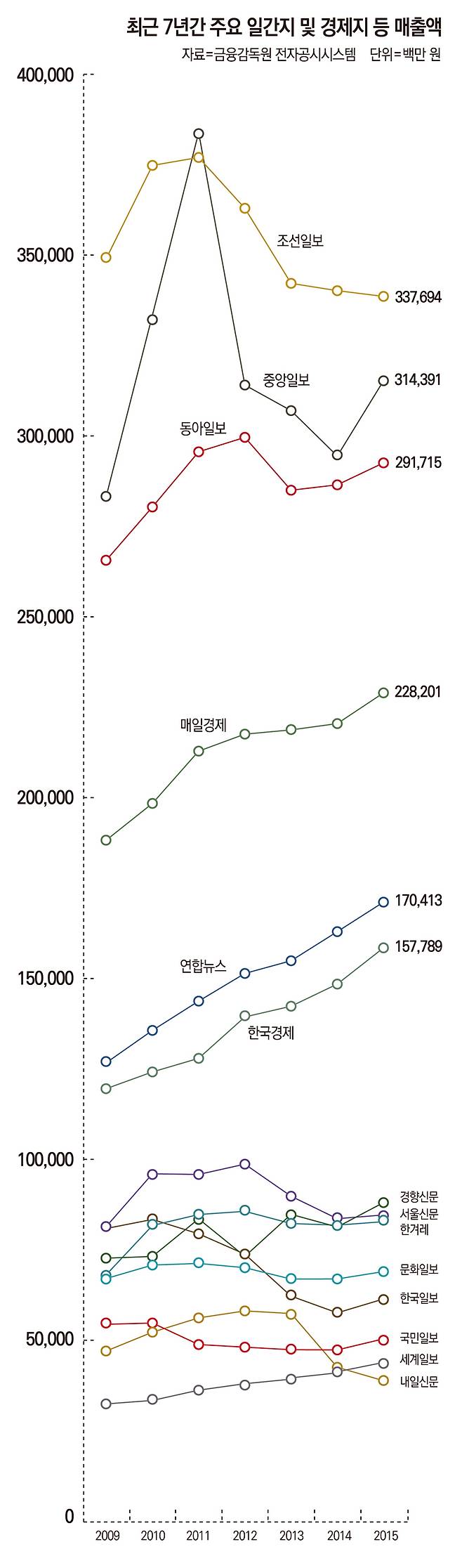 이 밖에도 서울신문의 지난해 매출액은 840억 원으로 2014년 대비 10억 원 증가했고, 한겨레의 매출액 821억 원도 10억여 원 증가한 결과다.