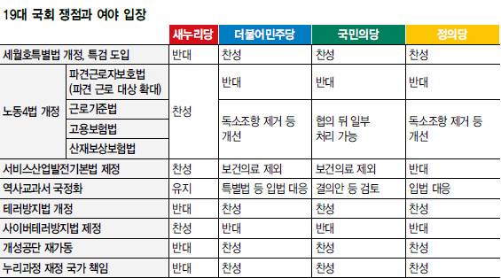 다만 총선 참패로 국정 운영의 주도권을 야당에 빼앗긴 새누리당이 19대 국회 안에 주요 쟁점법안 가운데 일부라도 통과시키려면 야당의 요구를 어느 정도 수용할 수밖에 없어, 5월 초 여야가 새 원내지도부를 구성한 뒤 일부 법안 처리에 나설지 주목된다.