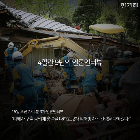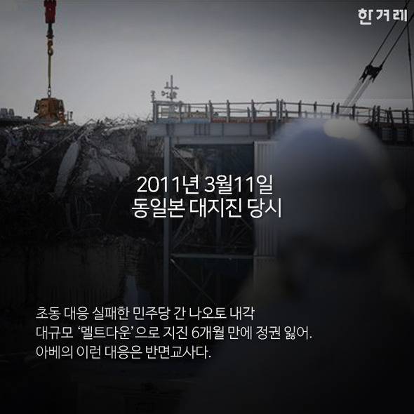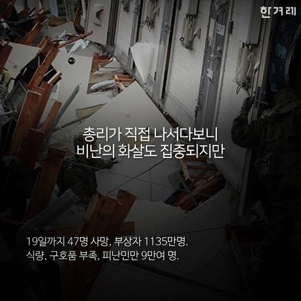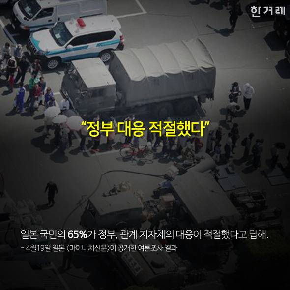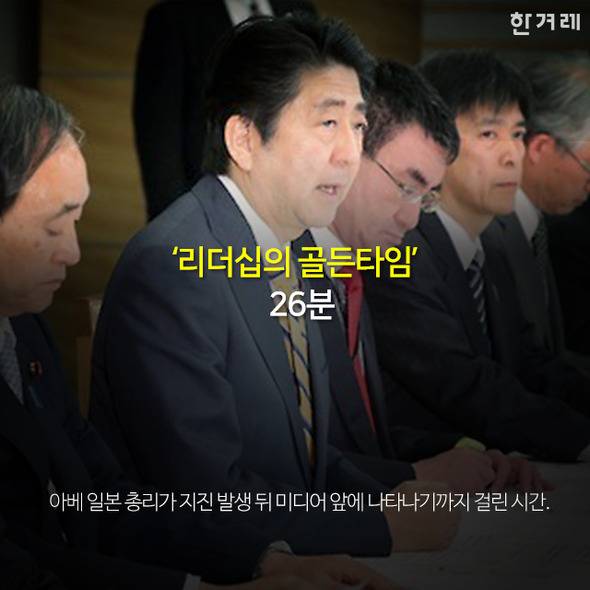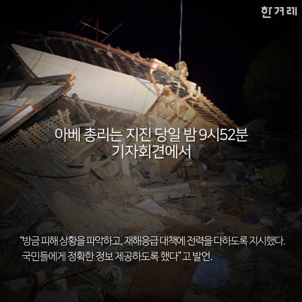 [한겨레] 최악의 지진이 발생했지만, 일본 국민의 65%가 아베 정부의 재난 대응이 적절했다고 평가했습니다. 아베 총리가 미디어 앞에 처음 모습을 드러낸 건 지진 발생 26분 뒤입니다. 7시간 동안 종적조차 알 수 없던 우리 대통령과 여러모로 비교되는 장면입니다.