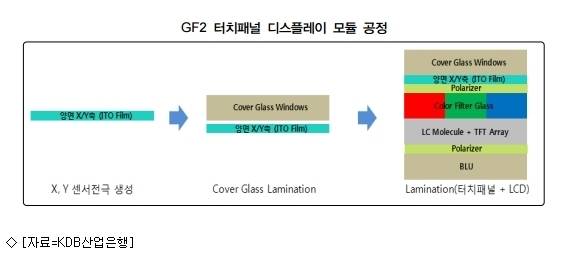 GG(Glass-Glass)는 커버글래스와 디스플레이 패널 사이에 글래스가 삽입되는 외장형(애드온) 방식을 말한다. 글래스 기판 위에 전극을 형성한 덕분에 필름 기판에 비해 빛의 투과율이 좋지만 두껍고 무겁다는 단점이 있다. 다양한 디자인을 적용하기 어렵다는 것도 약점이다.