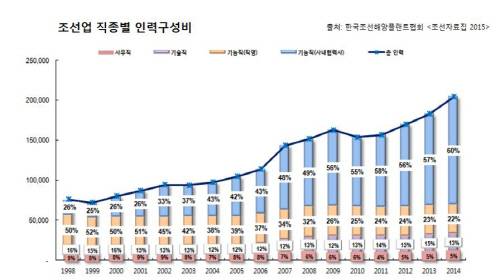대기업이 무리하게 해양플랜트 산업에 진출하면서 조선업계의 노동환경은 ‘하청화’가 가속화됐다. 조선업계 하청노동 비율은 IMF 외환위기 첫해인 1998년부터 인건비 절감을 위해 증가하다가 2008년부터 급증하는 모양새를 띤다. 2008년 글로벌 금융위기를 극복한 것처럼 보였던 것은 대기업뿐이지 국내 조선업계 전체는 빅3 중심 구조가 강화되면서 더 나빠진 상태였다. 특히 금융위기의 여파와 키코 피해로 중소 조선업체가 줄도산하면서 이곳의 인력들이 대기업으로 몰려들었고, 이들은 대부분 ‘사내하청’으로 채용됐다. 박종식 금속노조 객원연구위원은 지난해 발간한 금속노조 이슈페이퍼에서 “하청 기능직의 수는 지속적으로 증가해 2000년 2만5960명에서 2013년 10만5041명으로 거의 4배 정도로 증가했다”고 밝혔다.