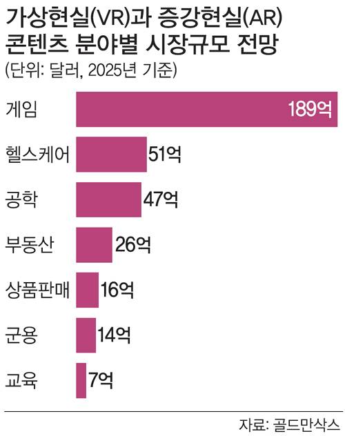 미국 투자은행 골드만삭스는 2025년까지 VR 시장이 350억달러로 늘고 이 중 189억달러(54%)가 게임분야일 것으로 전망했다.