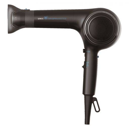 유닉스전자가 자체 개발한 3D 에어 스핀 노즐은 상하좌우 360도로 회전하는 프로펠러가 노즐 안쪽에 장착되어 강력한 UHDC 모터와 함께 회오리 바람을 형성시켜 고온의 바람이 특정 부위에 집중되지 않고 모근부터 모발 끝까지 고르게 전달해 건조 시간은 반으로 줄이고 모발 내 큐티클 손상을 최소화한다. 3D 입체 바람이 모발 전체를 풍부하게 감싸면서 모근 부분에 볼륨감을 더해주어 스타일링 유지에도 도움을 준다.