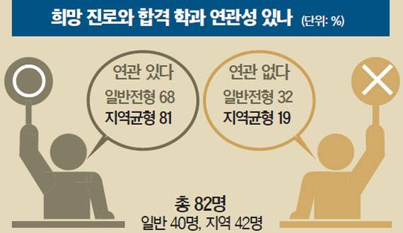 지난해 서울대 수시모집 합격자 82명을 분석한 결과 두 사람처럼 학생부에 기재된 희망 진로와 합격학과 사이 연관성이 뚜렷했다. 지역균형 합격생 중 약 81%, 일반전형은 약 68%가 희망 진로와 합격학과 사이에 연관성이 확실하게 나타났다. 예를 들어, 회계사→경제·경영학과, 수학 교사→수학교육과, 치의학자→치의학과와 같은 식이다. 임성호 종로학원하늘교육 대표는 “1학년 때부터 지원 동기가 뚜렷하고, 3년 동안 희망 진로와 관련해 동아리·봉사·독서 등 비교과 활동을 체계적으로 펼친 학생들이 합격했다”고 분석했다.