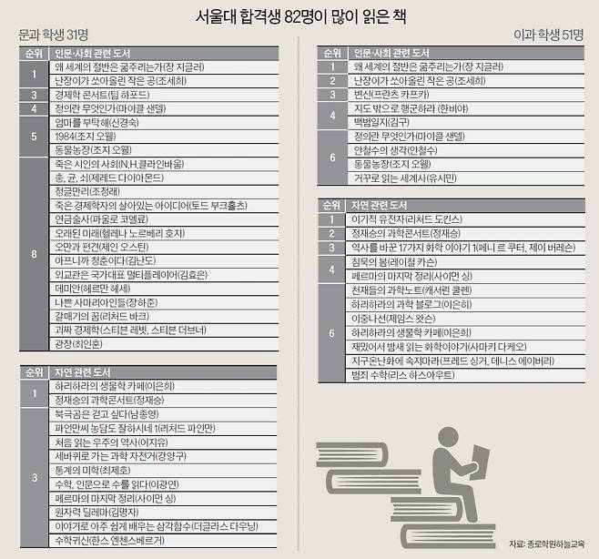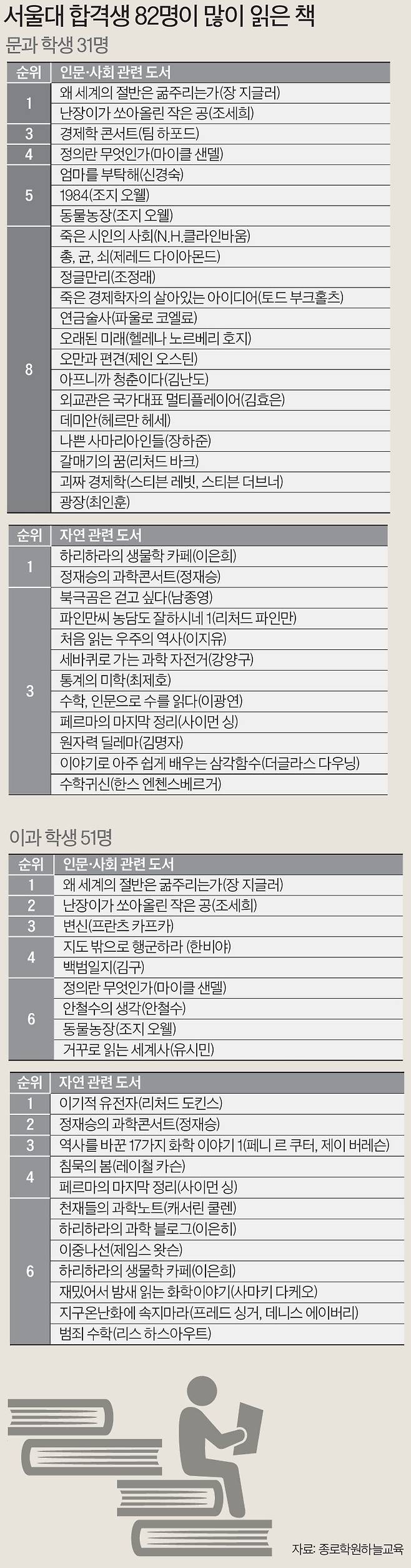 서울대 수시모집 합격생 82명(인문계열 31명, 자연계열 51명)이 가장 많이 읽은 책을 살펴보면 인문계열 학생들은 『왜 세계의 절반은 굶주리는가』(장 지글러), 『난장이가 쏘아 올린 작은 공』(조세희), 『경제학 콘서트』(팀 하포드)와 같은 인문·사회 관련 책을 읽으면서 『하라하라의 생물학 까페』(이은희), 『정재승의 과학 콘서트』(정재승)와 같은 과학 서적을 가장 많이 읽은 것으로 조사됐다. 자연계열 합격생은 과학 관련 도서로 『이기적 유전자』(리처드 도킨스)를, 인문·사회 서적으로 『왜 세계의 절반은 굶주리는가』를 읽은 학생이 많았다.