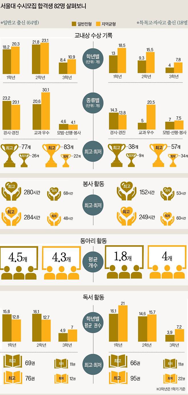 서울대에 들어가는 건 어떤 학생들일까요. 일단 서울대 합격생 열에 일곱은 수시모집을 통해 들어갑니다. 서울대는 지난해 전체 모집 인원의 약 73%(2286명)를 수시모집에서 학생부종합전형으로 선발했습니다. 학생부종합전형은 교과(내신)와 동아리·봉사·독서 등 비교과를 종합적으로 평가합니다. 수능처럼 딱 줄이 세워지는 평가가 아닙니다. 전 과목 내신 1등급 학생도 떨어지는 경우가 많습니다. 그러면 뭐가 중요한 걸까요. 지난해 서울대 수시모집에 합격한 82명의 내신과 비교과 스펙을 분석했습니다. 분석 결과 무엇보다 진로 목표가 뚜렷한 학생이 많았습니다. 서울대 합격생 82명이 가장 많이 읽은 책 목록도 공개합니다. 수시모집은 다시 지역균형과 일반전형으로 나뉩니다. 지역균형이 약 19%(597명), 일반전형은 약 54%(1689명)를 차지했습니다. 전형에 따른 스펙의 차이도 알아봤습니다.