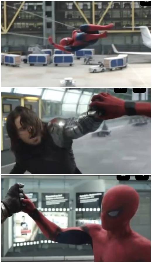 윈터솔져의 주먹을 한 손으로 막아내며 농담을 던지는 스파이더맨의 모습이 담겼다.