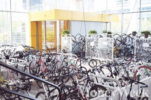 자전거를 끌고 엔씨소프트 방향으로 걸어가는 한 남성을 따라가니 엔씨소프트 ‘자전거주차장’이 보인다. 일렬로 세워진 수많은 자전거에 한번 놀라고 자전거정비소에 한번 더 놀랐다. 엔씨소프트에 따르면 직원 복지 차원에서 마련된 자전거정비소에서 자전거의 수리, 부품교체 등 자전거와 관련된 서비스가 제공된다. 이는 일부일 뿐이다. 지하 1층에 ‘자전거족’을 위한 더 넒은 자전거주차장이 있다.