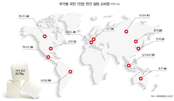 ‘설탕과의 전쟁’, 세계적인 화두다. 영국에서는 ‘설탕세’까지 도입됐다. 우리 정부도 최근 당류 섭취량을 줄이기 위한 종합 대책을 내놓았다. 식품의약품안전처는 4월7일 ‘당류 저감 종합계획’을 발표했다. 그런데 음료·과자 등 가공식품에 들어가는 첨가당만을 대상으로 삼았다. 과일과 우유의 당분은 제외했다. 그 이유는 무엇일까. 식품공학 전문가인 최낙언 ‘시아스’(식품업체) 이사는 “과일과 우유에도 당이 많지만 정부가 농가의 눈치를 보느라 이는 문제 삼지 않으면서, 만만한 가공식품의 첨가당만 겨냥한 것”이라며 “게다가 우리는 당류를 그렇게 많이 먹는 편이 아니므로 정부의 이번 정책은 번지수를 잘못 짚은 셈”이라고 지적했다.