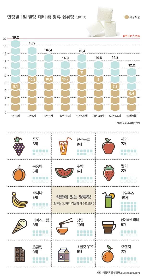그러자 식약처는 첨가당 섭취량을 연령대별로 분석한 후 어린이·청소년 첨가당 섭취를 지적했다. 3~29세까지의 하루 첨가당 섭취량이 열량의 10.2~11%로 기준(10%)을 초과했다는 것이다. 이들이 즐겨 찾는 음료와 과자 등 가공식품이 그 원인으로 추정됐다. 하루에 섭취하는 당류의 19%를 음료수에서 얻고 있기 때문이다. 그러나 음료보다 과일에서 섭취하는 당류는 22%로 더 많다. 사과와 오렌지에는 각각 각설탕 7개 분량의 당분이 있다. 탄산음료(당분 각설탕 8개 분량)와 비슷하다.